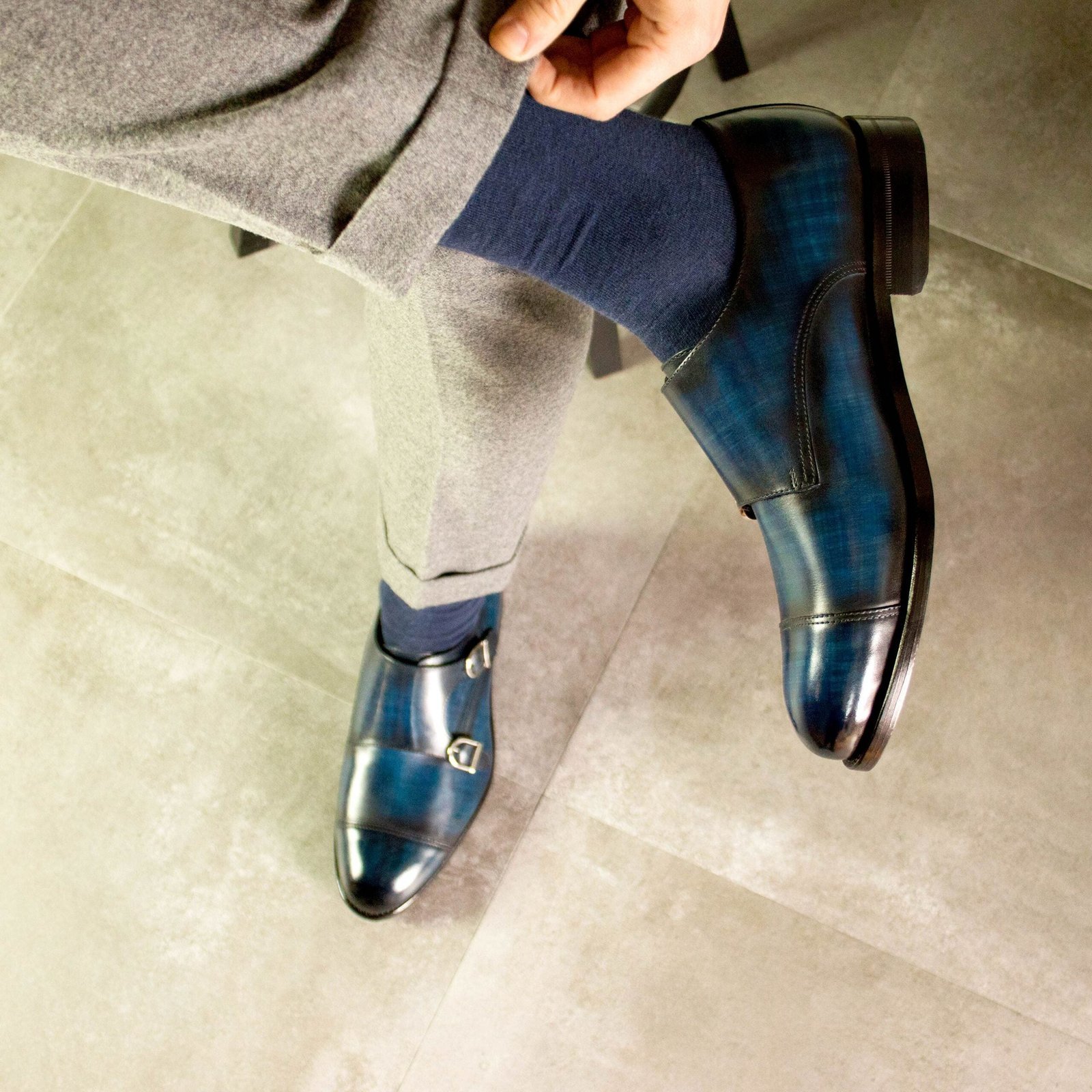 Introducing the Stylish Denim Patina Double Monk Shoes from our Fast Lane collection. These shoes are crafted from unique denim patina leather, offering a modern twist on a classic design. The Zurigo last, with its rounded toe, ensures a traditional English look while maintaining contemporary appeal.